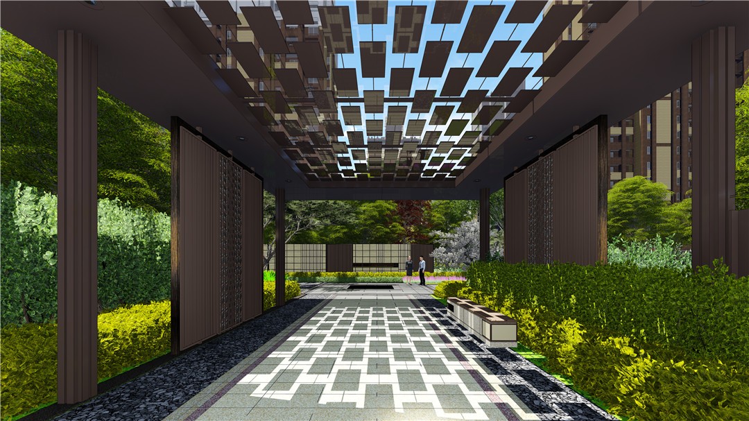 入口儀式空間:設計將入口崗亭、車庫結合為一體,體現入口尊貴大氣,植物上選擇標志性的喬木作為主景樹,地被成片種植,形成歸家禮儀式。