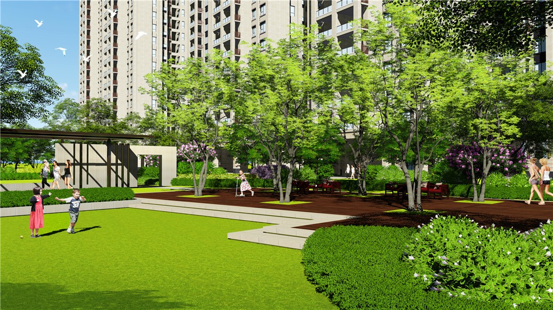 休閑木平臺活動區:從前場至后場,特色景墻和景觀廊架的設計對整體空間起到決定性的作用,特色景觀廊架更是通過框景使得空間多樣化。林下休閑木平臺間為住戶打造一處納涼空間。平臺前一處開闊草坪,穿過廊架景墻,給人一種豁然開朗感覺。