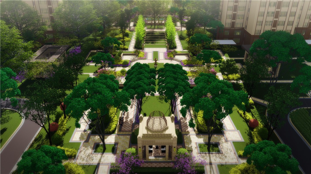 景觀結構采用軸線景觀與自然景觀相結合的形式,中央藝術公園軸線對稱,秘密花園然、舒適、閑適、幽靜。
