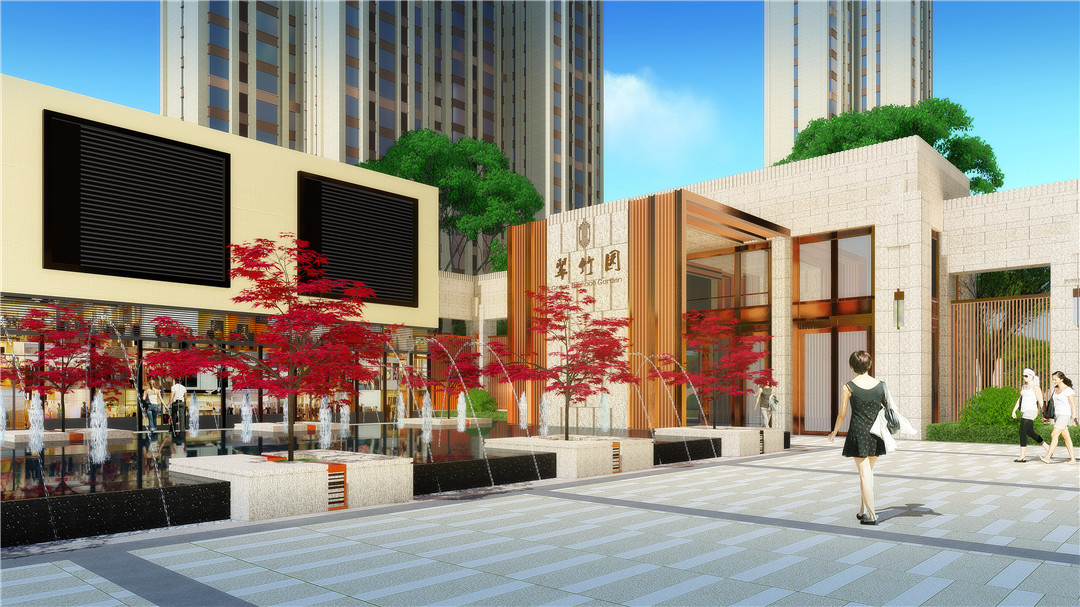 其一入口空間,通過山、林、竹、石、譚、瀑元素運用打造富有人文底韻的商業(yè)景觀